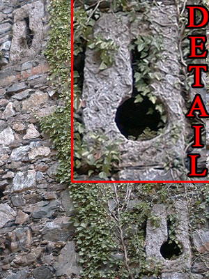 An jedem Turm befinden sich zwei bis drei Geschützscharten in verschiedenen Stockwerken. Rechts oben ist das Detail der darunter liegenden Schlüsselscharte zu sehen.