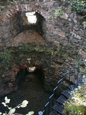 Hier ein Blick zurück in das Innere des Rundturms. Über die Metalltreppe ist es ein leichtes, nach oben zu gelangen. Das Niveau des Innehofs der Ruine befindet sich ca 2m überhalb des untersten Niveaus der Rundtürme.