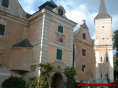 Hier nochmal die gesamte Eingangsfront. Im Torbau und dem Viereckturm sind noch Reste des alten, ursprünglichen Bau´s zu sehen.